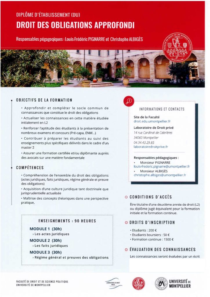 • Diplôme Universitaire : Droit des obligations approfondi